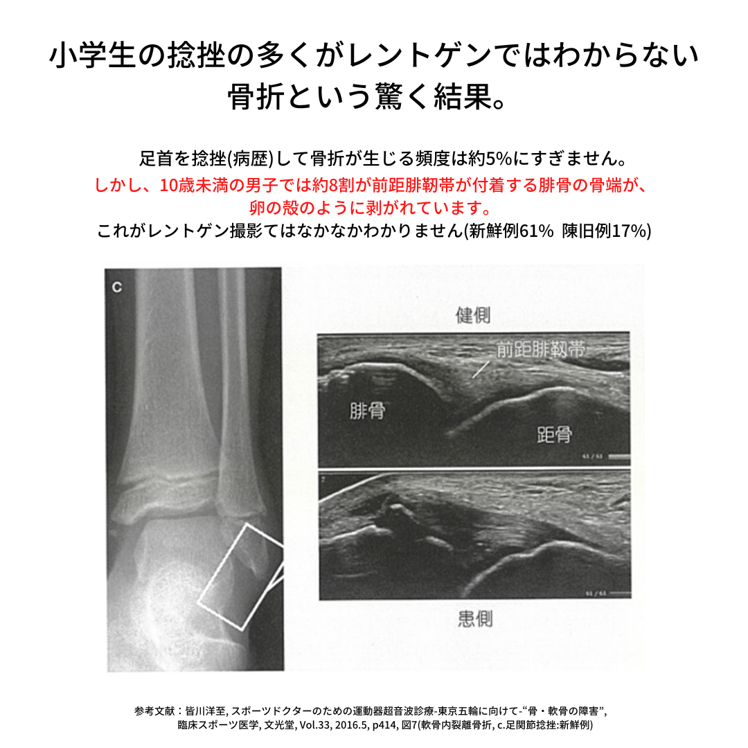 当院ではスポーツを習っているお子様が多数ご来院されます。 (サッカー、水泳、野球、テニス、バレエ、etc…) 先日来られた患者様の例を挙げると 小学校一年生女子 階段を踏み外して左足関節を捻挫。 普通の捻挫と思い放置をしたが、なかなか痛みが引かない それどころか痛みが上がってる。 ということで病院に受診してみると足首の靭帯に引っ張られ 骨片骨折を合併していました。 その後当院にご相談が・・・